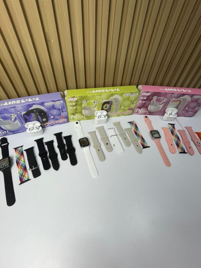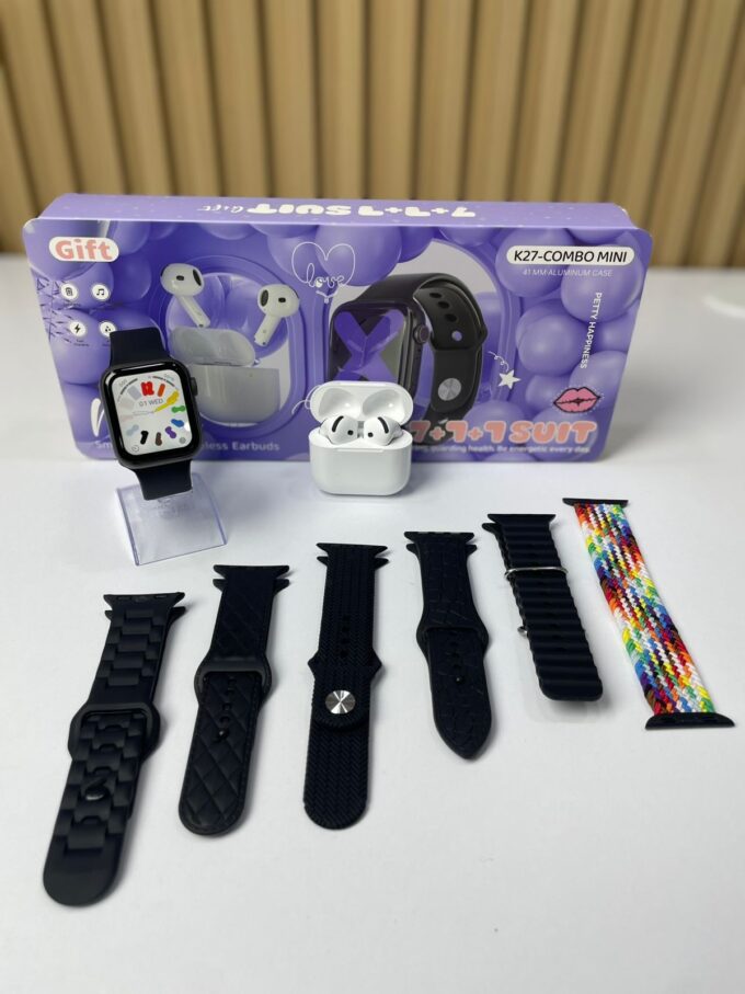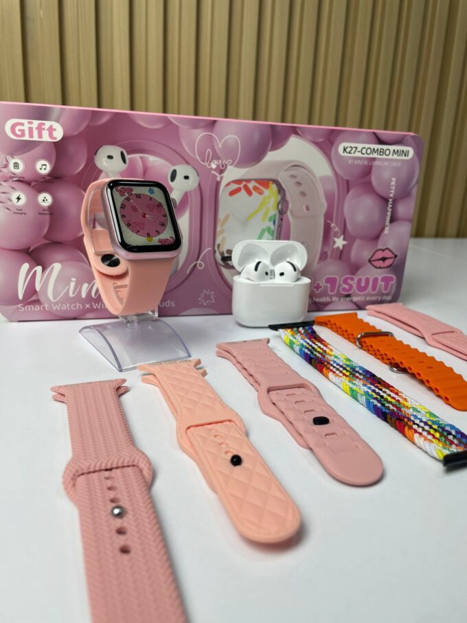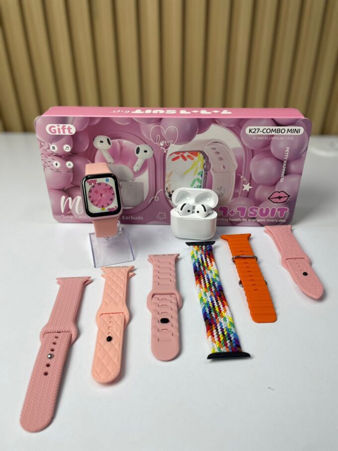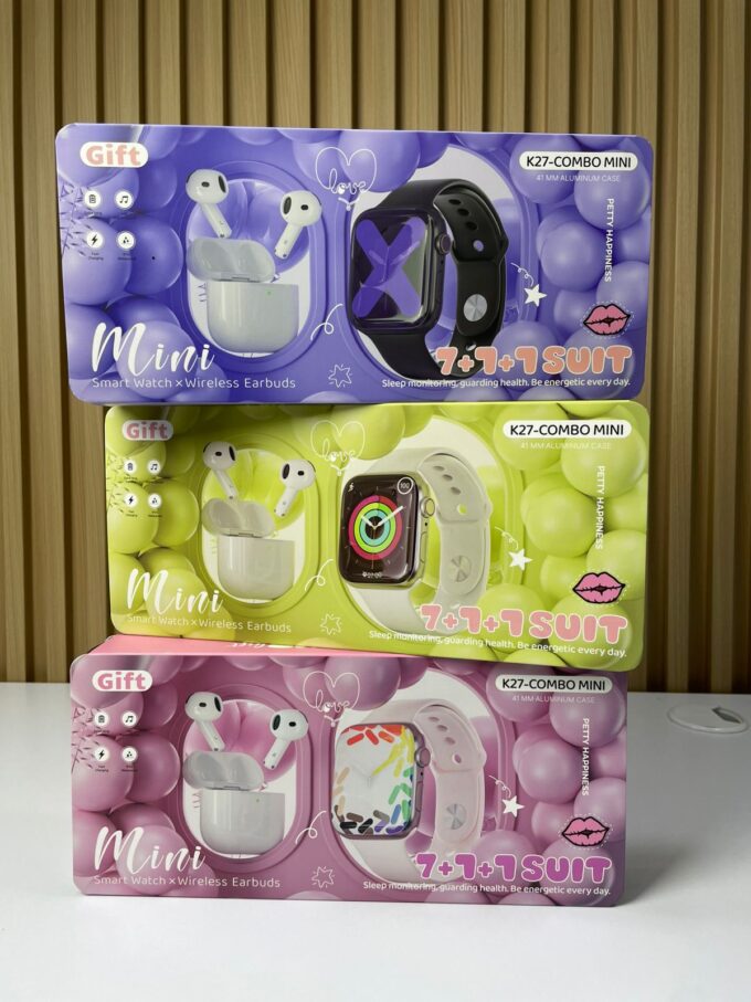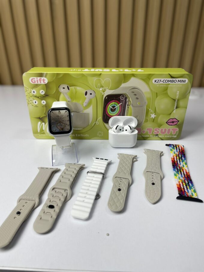El K27-COMBO MINI es un set compacto y elegante que incluye un reloj inteligente de 41 mm con caja de aluminio y unos audífonos inalámbricos con estuche de carga. Está diseñado para ofrecer practicidad, conectividad y estilo en un formato mini, ideal para uso personal o como regalo.
