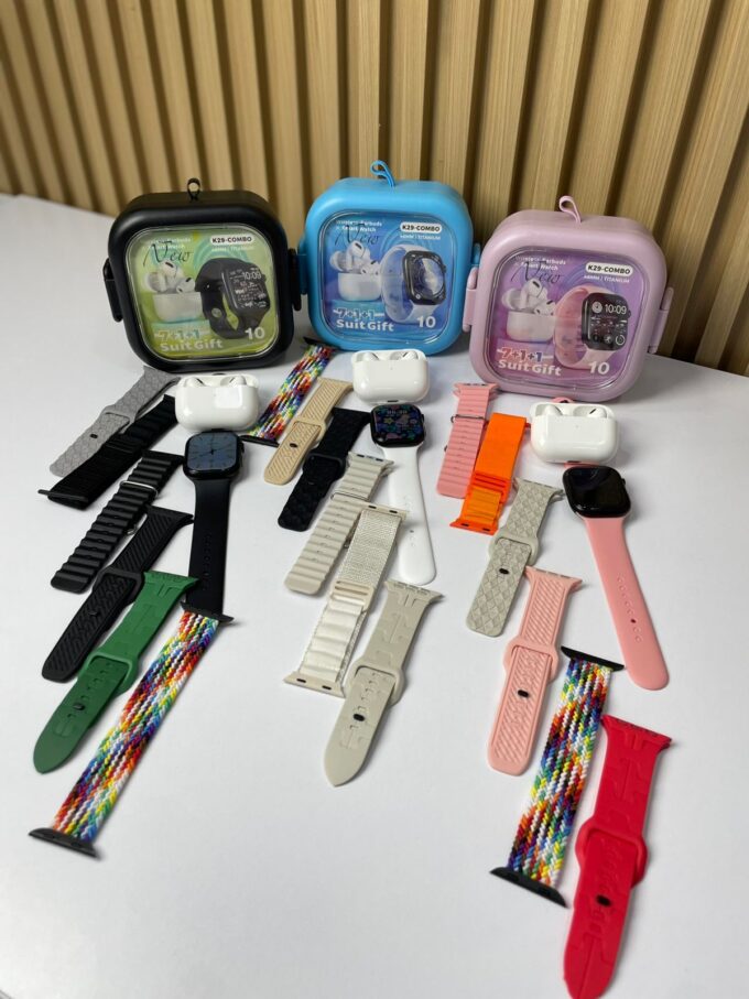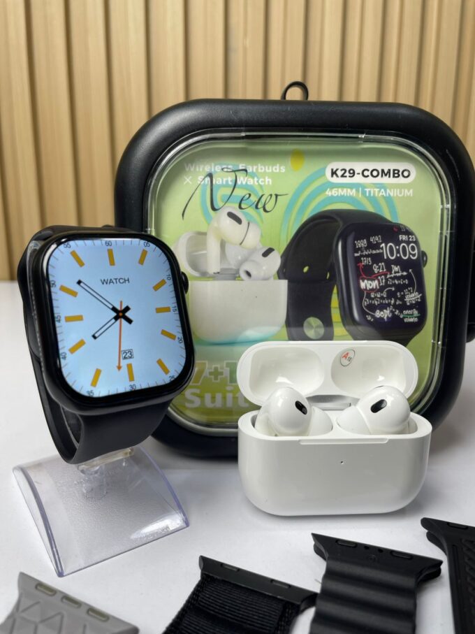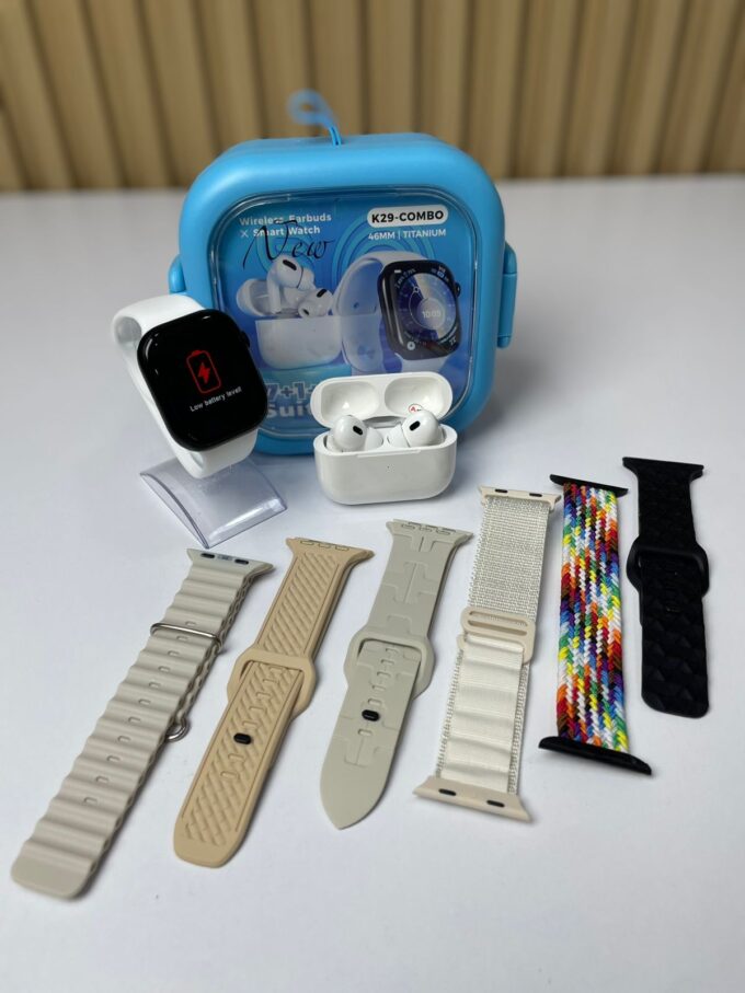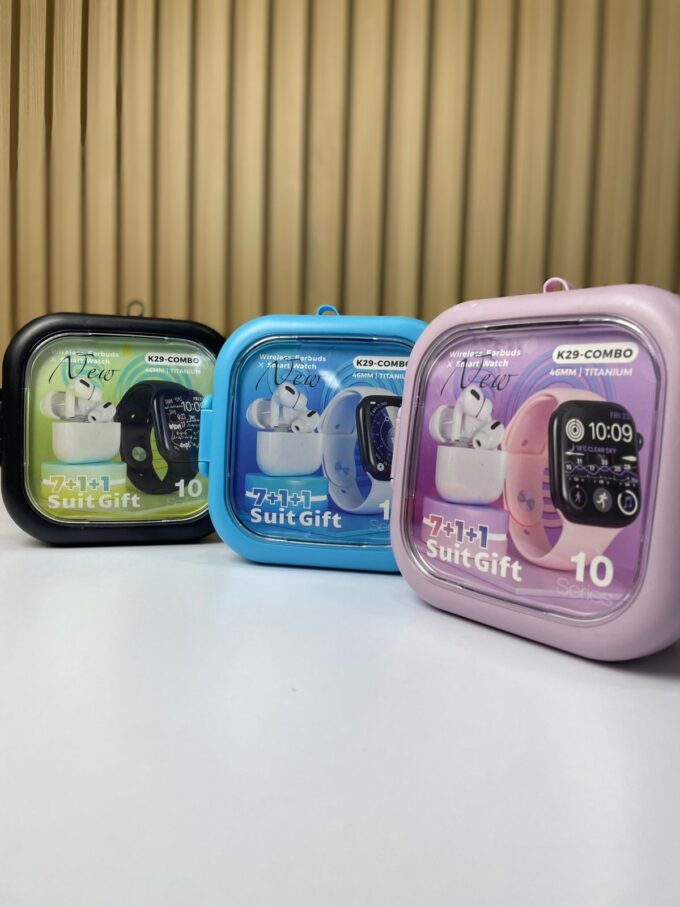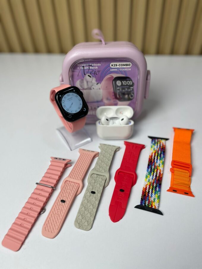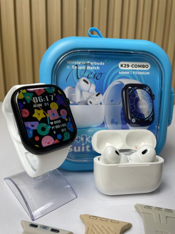El K29-COMBO es un set tecnológico completo que incluye un reloj inteligente de 46 mm con caja de titanio y unos audífonos inalámbricos con estuche de carga, todo presentado en un práctico estuche rígido disponible en colores modernos (negro, azul y rosa). Diseñado para quienes buscan estilo, conectividad y practicidad en un solo paquete