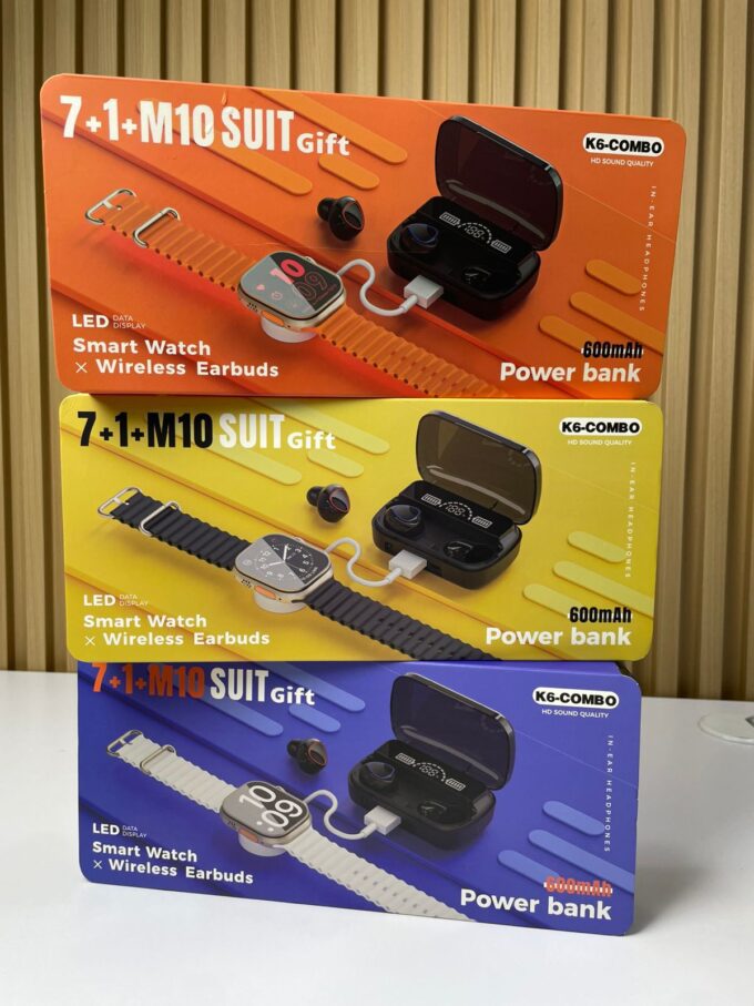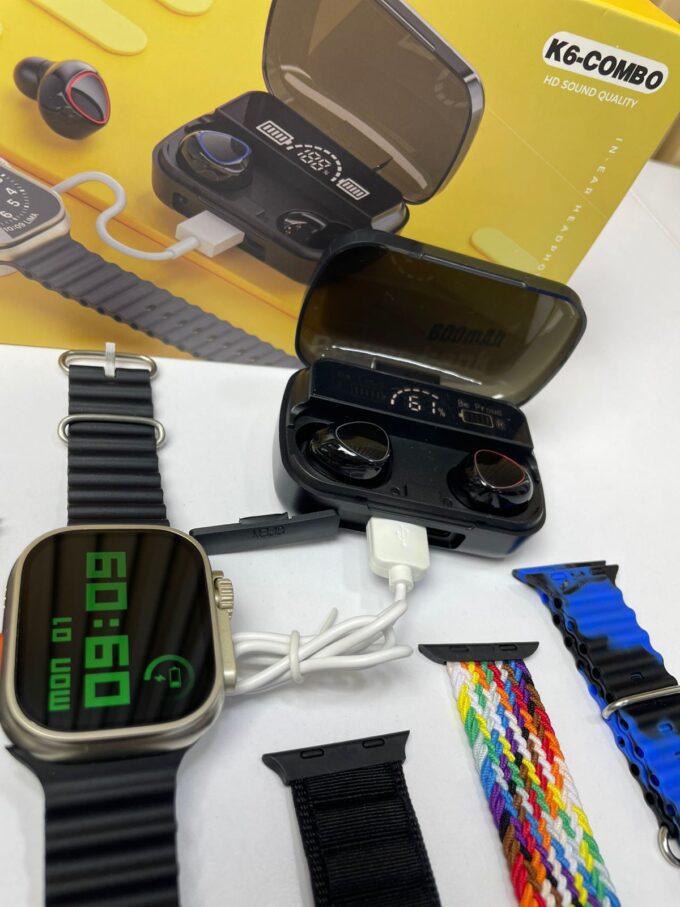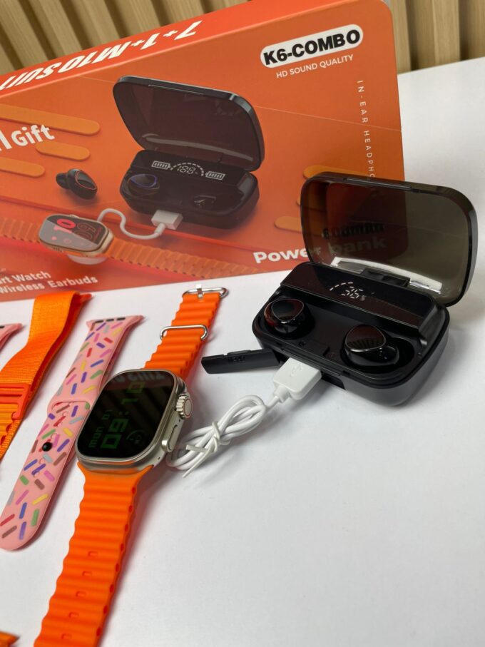 El K6-COMBO es un set tecnológico que combina un reloj inteligente con pantalla LED, unos audífonos inalámbricos in-ear y un estuche de carga con función Power Bank de 600 mAh. Su diseño práctico y multifuncional lo convierte en una opción ideal para quienes buscan conectividad, entretenimiento y autonomía en un solo paquete.