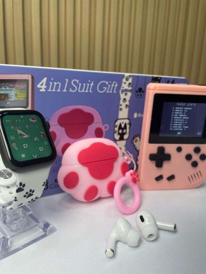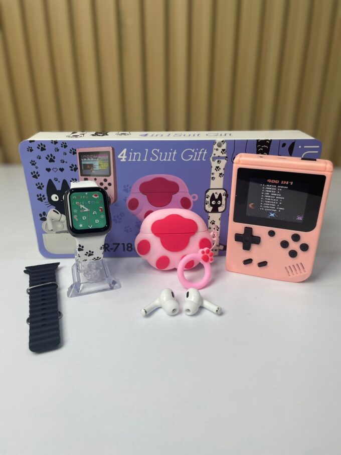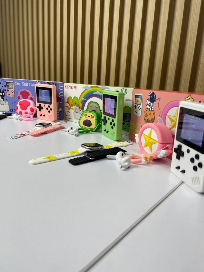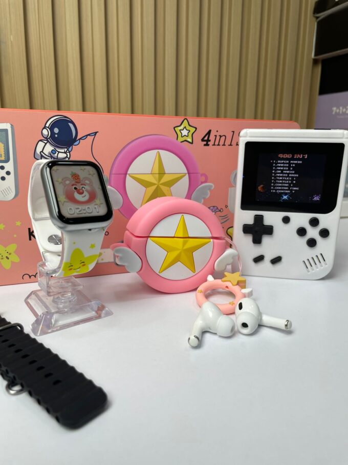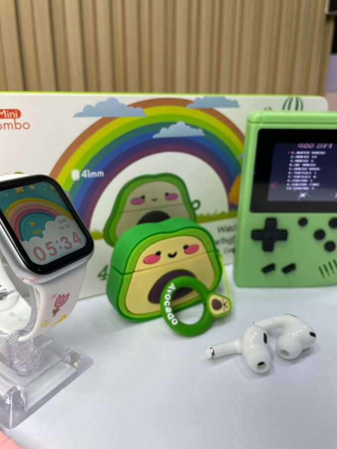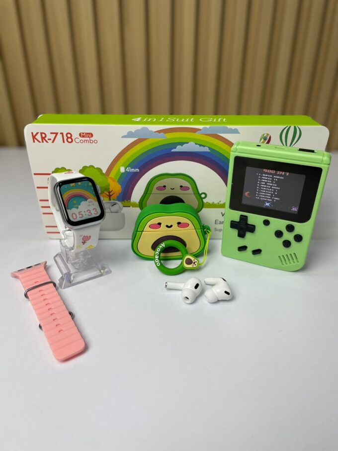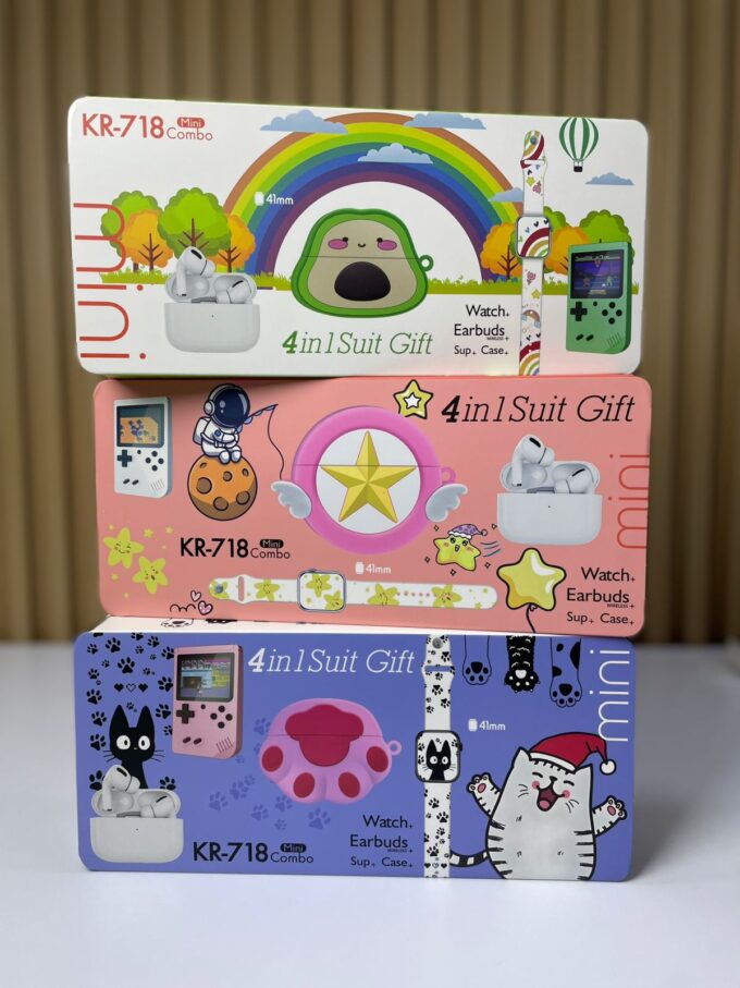 El KR-718 Mini Combo (4 en 1 Suit Gift) es un set tecnológico y divertido que incluye un reloj inteligente de 41 mm, unos audífonos inalámbricos tipo earbuds, un estuche de carga protector y accesorios temáticos decorativos. Con un diseño juvenil y colorido, es ideal para quienes buscan practicidad, estilo y entretenimiento en un solo paquete.