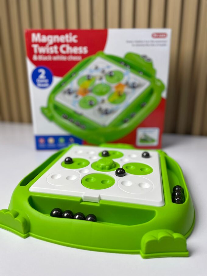 El Juego Magnético Dinosaurio – Magnetic Twist Chess es un tablero interactivo para niños mayores de 3 años, que combina elementos de estrategia con el uso de esferas magnéticas. El tablero tiene un diseño en forma de dinosaurio, lo que lo hace atractivo visualmente y más divertido para los pequeños. Su sistema de rotación permite cambiar la disposición de las piezas en cada turno, generando giros inesperados en el desarrollo del juego.