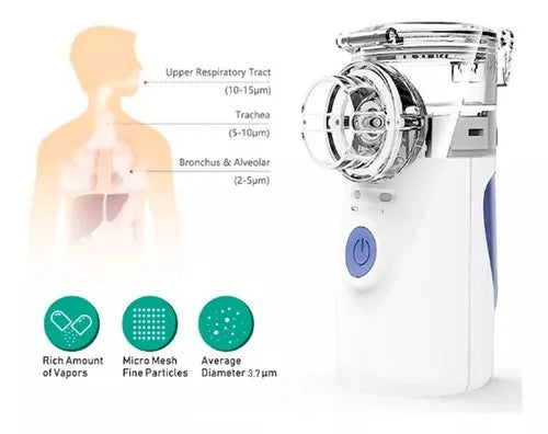 Genera una fina niebla para una mejor absorción del medicamento. Funciona con 2 pilas AA o por cable USB.