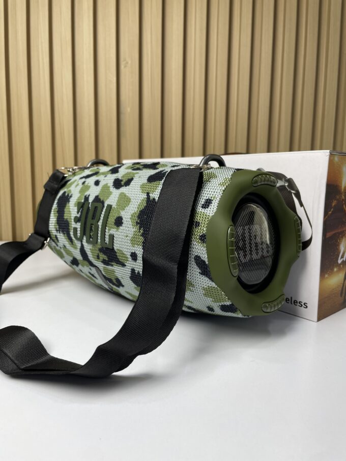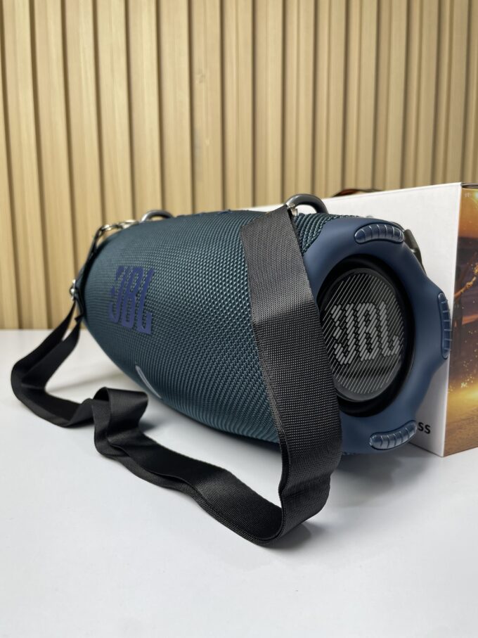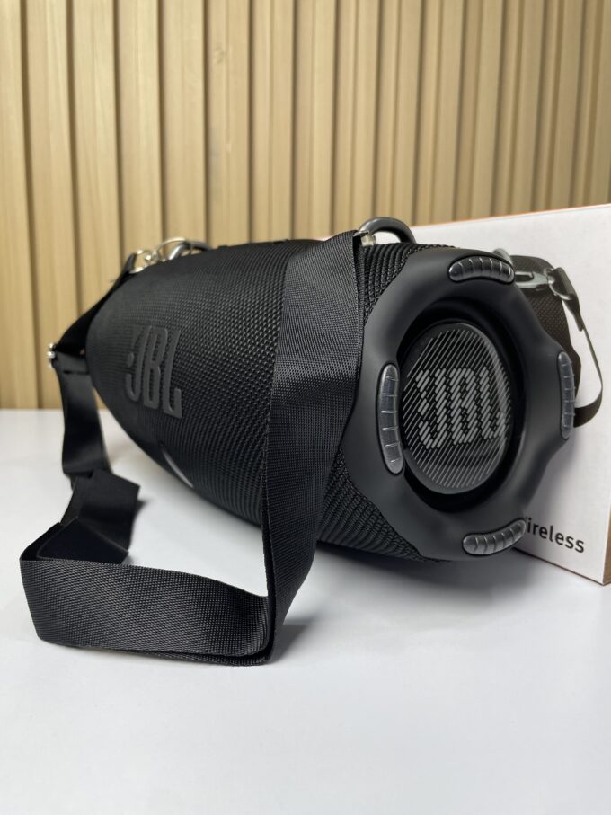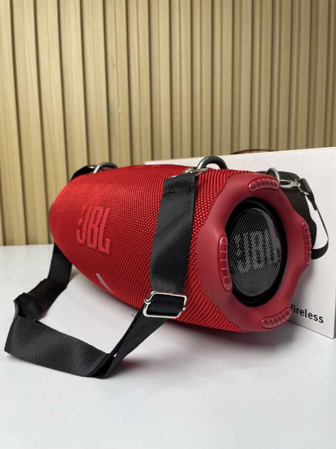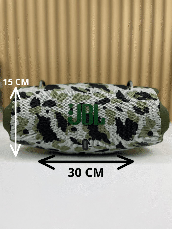 El JBL Xtreme 4 es un altavoz portátil inalámbrico diseñado para ofrecer alta potencia de sonido en exteriores e interiores. Su estructura cilíndrica incorpora radiadores pasivos laterales que potencian los graves y una carcasa recubierta con material textil resistente, lo que garantiza durabilidad en condiciones de uso intensivo.